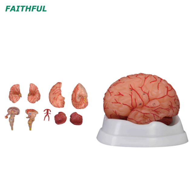 Características externas del cerebro: hemisferio cerebral, vástago cerebral, cerebelo. Disección en 9 partes, tamaño de vida con número. En stand.