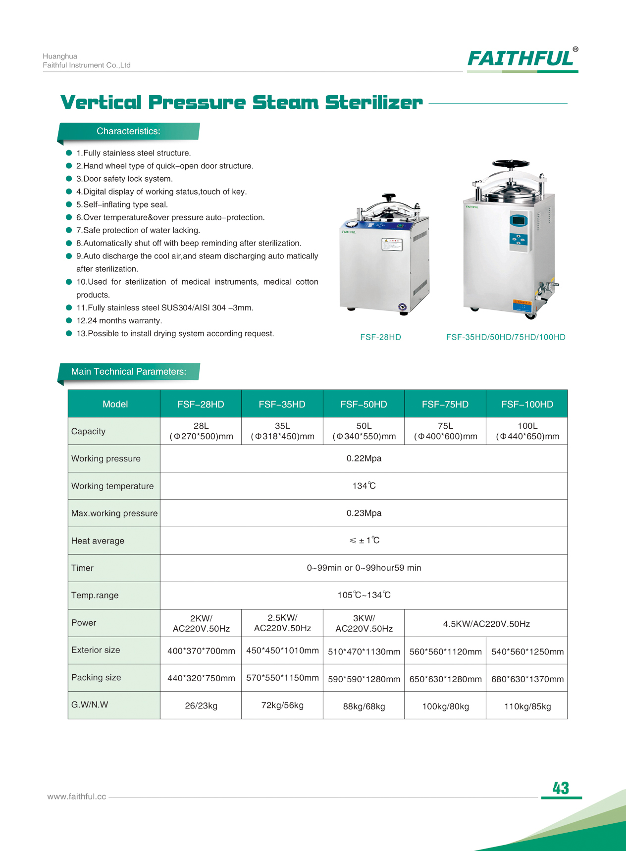 Volumen de la cámara | 35L Φ318*415mm | 50L Φ340*550mm | 75L Φ400*600mm | 100L Φ440*650mm |