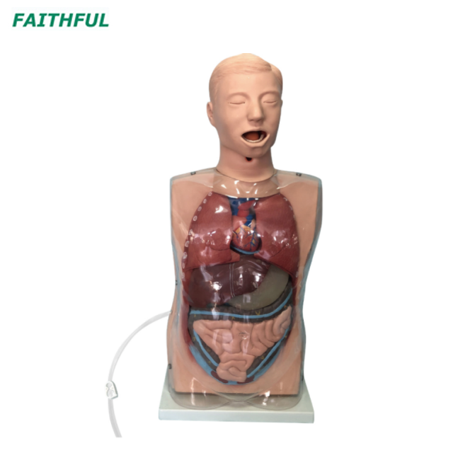 2) El modelo es una parte superior del cuerpo adulta estándar, tiene estructuras anatómicas de la cavidad torácica, la cubierta torácica transparente puede demostrar la operación visualmente.