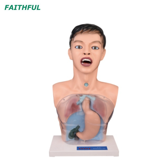 El modelo simula una estructura macho de la parte superior del cuerpo adulto, con estructura anatómica de la cavidad nasal, cavidad oral, dientes, lengua, úvula, respuesta, cuerda vocal, tráquea, pulmones, esófago, estómago, hígado e intestino pequeño. El simulador está hecho de material importado con sensación de contacto realista, y el estómago está hecho de material transparente de alta intensidad, que es conveniente de observar, puede observar directamente los órganos y estructuras realistas de la cavidad torácica y la cavidad abdominal y el proceso de lavado gástrico. Ayudante para la enseñanza y capacitación de enfermería pediátrica.