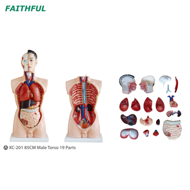 Este es un torso masculino de tamaño completo. Pintado a mano y meticulosamente ensamblado para simular la anatomía humana. Se disecciona en 19 partes: torso, cabeza (2 partes), cerebro, pulmón (4 partes), corazón, tráquea, esófago y aorta descendente, diafragma, estómago, duodeno con páncreas y bazo, intestinos, riñón, vejiga (2 partes) y vejez hígado.