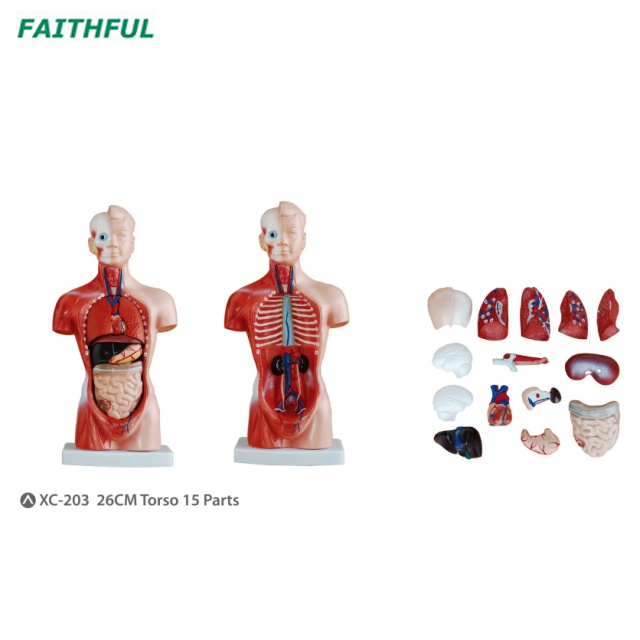 Este torso educativo más popular presenta 15 partes, que incluyen torso, cerebro (2 partes), calvario de corte, corazón, pulmón (4 partes), estómago, diafragma, hígado, corazón, tráquea y esófago y aorta, páncreas y bache.