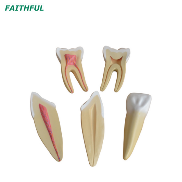 Este modelo muestra las diferencias morfológicas del incisivo, los dientes caninos y molares. Las disecciones de los dientes caninos y molares demuestran la estructura del esmalte, la cavidad de la pulpa dental.